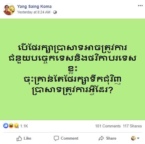 លោកយ៉ង សាំងកុមារ ប្រធានគណៈកម្មាធិការនាយកគណបក្សប្រជាធិបតេយ្យមូលដ្ឋាន បានសរសេរនៅក្នុងទំព័រហ្វេសប៊ុករបស់លោក នៅថ្ងៃទី១០ ខែមិថុនា ឆ្នាំ២០២០ ថា “បើថែរក្សាប្រាសាទ អាចត្រូវការជំនួយបច្ចេកទេស និងថវិកាបរទេសខ្លះ ចុះគ្រាន់តែថែរក្សាទឹកជុំវិញប្រាសាទ ត្រូវការអ្វីដែរ?”។
