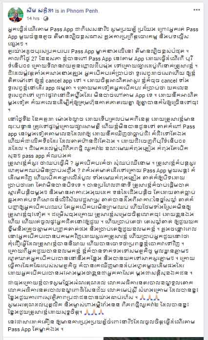 គណនីហ្វេប៊ុកដែលនេះ បានបន្តថា “នៅថ្ងៃទី២ ខែកក្កដា ម៉ោង៦ល្ងាច ដោយទើបត្រលប់មកពីខេត្ត ដោយគ្រួសារខ្ញុំមានធុរៈបន្ទាន់ ត្រូវទៅផ្ទះម្ដុំក្រោយផ្សារសាមគ្គី ហើយខ្ញុំមិនបានជូនទៅ គាត់ក៏ហៅ Pass app នេះម្ដងទៀតតាមលេខដែលវាឲ្យ ដោយនឹកឃើញថាធ្លាប់ជិះ ក៏ជិះទៅតែឯង ហើយក៏ជាលើកទី១ដែរ ដែលគាត់ហ៊ានជិះតែឯង។ ដោយជិះចេញពីបុរីទំនើប០១ ដដែល។ ជិះមកដល់ម្ដុំបុរីពិភពថ្មីឈូកវ៉ា២ ខណៈមេឃកំពុងភ្លៀងកំពុងតែបើកសុខៗ pass app ក៏ឈប់ងក់