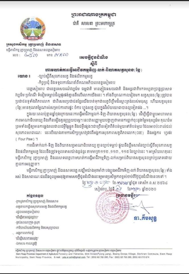 យោងតាមសេចក្តីជូនដំណឹងរបស់មន្ទីរ កសិកម្ម រុក្ខាប្រមាញ់ និងនេសាទ ខេត្តសៀមរាប លេខ ២៩៣ មកន.សជណ ចុះថ្ងៃចន្ទ ១រោច ខែអាសាធ ឆ្នាំជូត ទោស័ក ព.ស ២៥៦៤ ត្រូវ នឹងថ្ងៃទី០៦ ខែកក្កដា ឆ្នាំ២០២០ ដែលចុះហត្ថលេខាដោយលោកទា គឹមសុទ្ធ ជាប្រធានមន្ទីរ ស្តីពីការហាមឃាត់ការធ្វើអាជីវកម្មទិញ-លក់-ពិឃាតសត្វសុនខ (ឆ្កែ) ដោយយោងច្បាប់ស្តីពីសុខភាពសត្វ និងផលិតកម្មសត្វ និងយោងកិច្ចប្រជុំ និងការទទួលការណែនាំពីគណៈអភិបាលខេត្តសៀមរាប បានបញ្ជាក់ថា “ខេត្តសៀមរាប ជាខេត្តទេសចរណ៍វប្បធម៌ធម្មជាតិ មានភ្ញៀវទេសចរជាតិ និងអន្តរជាតិ មកទស្សនា ប្រាង្គប្រាសាទ វប្បធម៌ ប្រពៃណី ទំនៀមទម្លាប់ ដ៏ល្អផូរផង់គ្មានពីរលើលោកយើងនេះ។