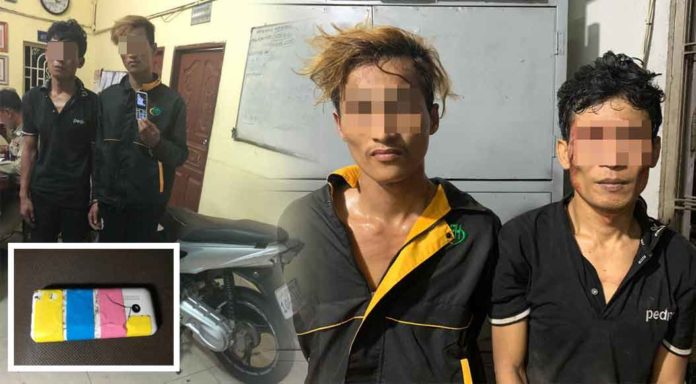 ភ្នំពេញ ៖ ជនសង្ស័យ២នាក់ឃើញជនរងគ្រោះកំពុងតែដេកដាក់កាសស្តាប់ចម្រៀង លើម៉ូតូកង់បី ដោយប្រើកាសអាយហ្វូន ដោតជាមួយនឹងទូរស័ព្ទអិនចុចពិល ធ្វើឱ្យជនសង្ស័យនឹកស្មានថាជាទូរស័ព្ទទំនើប ខំនាំគ្នាឆក់ តែបែរជាប៉ះទូរស័ព្ទអិនចុចពិល ហើយរត់គេចមិនរួច ត្រូវប្រជាពលរដ្ឋព័ទ្ធក្របួចជាប់។