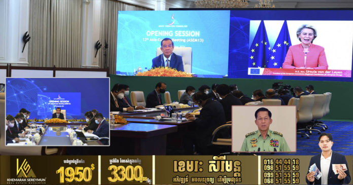 ភ្នំពេញ៖យោងតាមការចេញផ្សាយរបស់សារព័ត៌មានជប៉ុនក្យូដូកាលពីថ្ងៃព្រហស្បតិ៍ទី ២៥ វិច្ឆិកា ២០២១ បានអោយដឹងថា កិច្ចប្រជុំអាស៊ី-អឺរ៉ុប លើកទី១៣ ឬហៅកាត់ថា ASEM 13 ប្រទេសកម្ពុជាទទួលធ្វើជាម្ចាស់ផ្ទះ នៅតែបន្តគ្មាន វត្តមានមេដឹកនាំរបបយោធាមីយ៉ាន់ម៉ា លោកមីន អ៊ុងឡាំង ដែលល្បីល្បាញខាងបង្រ្កាបយ៉ាងព្រៃផ្សៃលើបាតុករ ដដែល។ នេះគឺជាអវត្តកិច្ចប្រជុំអន្តរជាតិធំៗលើកទីបីក្នុងរយៈពេល២ ដែលលោក មីន អ៊ុងឡាំង ត្រូវបានគេដាក់អោយនៅលើកោះឯកោមួយទាំងក្នុងក្នុងតំបន់អាស៊ានក៏ដូចជានៅលើឆាកអន្តរជាតិ។ប្រមុខរបបសឹកមីយ៉ាន់ម៉ាឧត្តមសេនីយ៍ មីន អ៊ុងឡាំង មិនមានវត្តមានក្នុងកិច្ចប្រជុំកំពូលអាស៊ី-អឺរ៉ុបលើកទី១៣ ឡើយ។ លោក មីន អ៊ុងឡាំង ត្រូវបានផាត់ចេញពីកិច្ចប្រជុំពីរលើកទៅហើយ។ នេះជាជំហររបស់អាស៊ានដែលមិនអញ្ជើញមេដឹកនាំរបបយោធាមីយ៉ាន់ម៉ារូបនេះ។