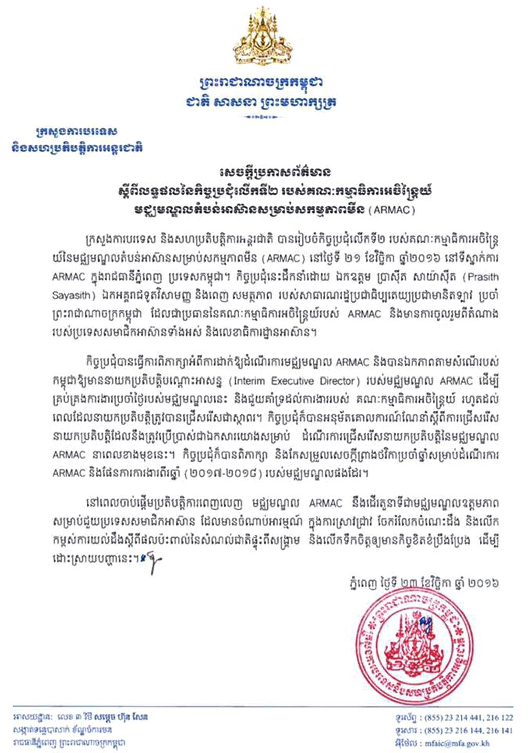 ភ្នំពេញៈ ក្រសួងការបរទេស និងសហប្រតិបតិ្តការអន្តរជាតិ នៅថ្ងៃទី២៣ ខែវិច្ឆិកា ឆ្នាំ២០១៦ បានចេញសេចក្ដីប្រកាសព័ត៌មាន ស្ដីពីលទ្ធផលនៃកិច្ចប្រជុំលើកទី២ របស់គណៈកម្មាធិការអចិន្ត្រៃយ៍មជ្ឈមណ្ឌលតំបន់អាស៊ាន សម្រាប់សកម្មភាពមីន ដោយបញ្ជាក់ថា នៅពេលចាប់ផ្ដើមពេញលេញ មជ្ឈមណ្ឌលតំបន់អាស៊ានសម្រាប់សកម្មភាពមីន នឹងដើរតួនាទីជាមជ្ឈមណ្ឌលឧត្តមភាព សម្រាប់ជួយប្រទេសសមាជិកអាស៊ាន ដែលមានចំណាប់អារម្មណ៍ ក្នុងការស្រាវជ្រាវ ចែករំលែកចំណេះដឹង និងលើកកម្ពស់ការយល់ដឹងស្ដីពីផលប៉ះពាល់នៃសំណល់ជាតិផ្ទុះពីសង្រ្គាម និងលើកទឹកចិត្តឲ្យមានកិច្ចខិតខំប្រឹងប្រែង ដើម្បីដោះស្រាយបញ្ហានេះ ៕