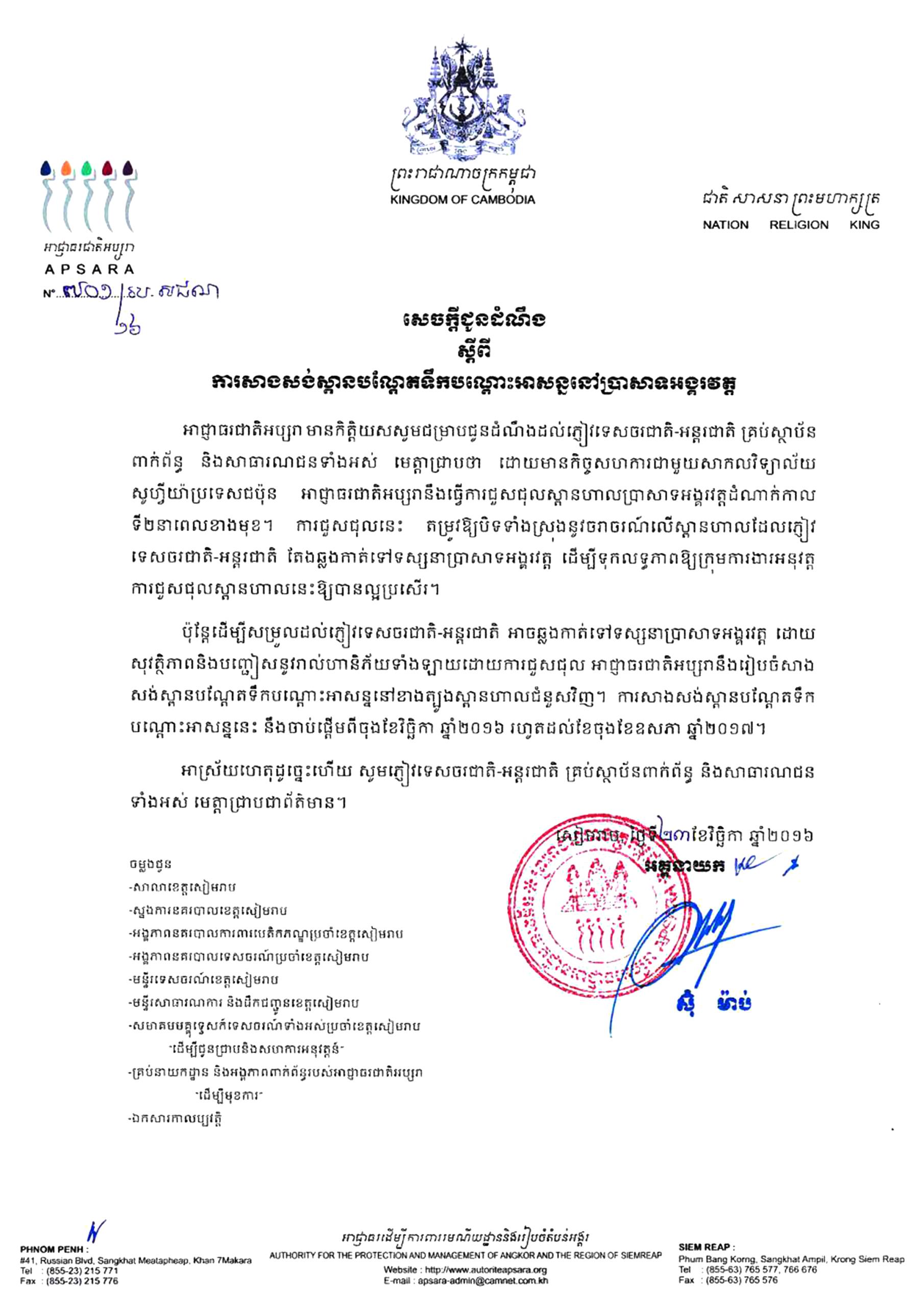 ខេត្តសៀមរាបៈ អាជ្ញាធរជាតិអប្សរា បានចេញសេចក្ដីជូនដំណឹងថា ដើម្បីសម្រួលដល់ភ្ញៀវទេសចរជាតិ និងអន្តរជាតិ អាចឆ្លងកាត់ទៅទស្សនាប្រាសាទអង្គរវត្ត ដោយសុវត្ថិភាព និងបញ្ចៀសនូវរាល់ហានិភ័យទាំងឡាយដោយការជួសជុលស្ពានហាលប្រាសាទអង្គរវត្ត ដំណាក់កាលទី២ នាពេលខាងមុខនេះ អាជ្ញាធរអប្សរា នឹងរៀបចំសាងសង់ស្ពានបណ្ដែតទឹកបណ្ដោះអាសន្ន នៅខាងត្បូងស្ពានហាល ជំនួសវិញ ដែលការសាងសង់នេះ ចាប់ពីចុងខែវិច្ឆិកា ឆ្នាំ២០១៦ ដល់ចុងខែឧសភា ឆ្នាំ២០១៧ និងមានការសហការាជាមួយសកលវិទ្យាល័យសូហ្វីយ៉ា ប្រទេសជប៉ុន ៕