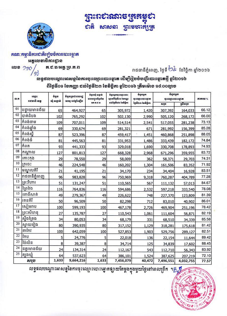 ភ្នំពេញៈ ខណៈដែលនៅសល់តែ៥ថ្ងៃទៀត ការចុះឈ្មោះបោះឆ្នោត ដើម្បីរៀបចំបញ្ជីបោះឆ្នោតថ្មី ឆ្នាំ២០១៦ ត្រូវបានបញ្ចប់ យោងតាមលទ្ធផលនៃការចុះឈ្មោះបោះឆ្នោត ដើម្បីរៀបចំបញ្ជីបោះឆ្នោតតាមបែបអេឡិកត្រូនិកនេះ គិតពីថ្ងៃទី០១ ខែកញ្ញា ដល់ថ្ងៃទី២៣ ខែវិច្ឆិកា ឆ្នាំ២០១៦ ត្រឹមម៉ោង១៨ៈ០០ល្ងាច បានបង្ហាញថា មានចំនួនសរុប៧.៤៩៦.៥៥១នាក់ ស្រី៤.៩៣២.៧៥៥នាក់ គិតជាភាគរយ៧៧,៥៧ភាគរយ ៕