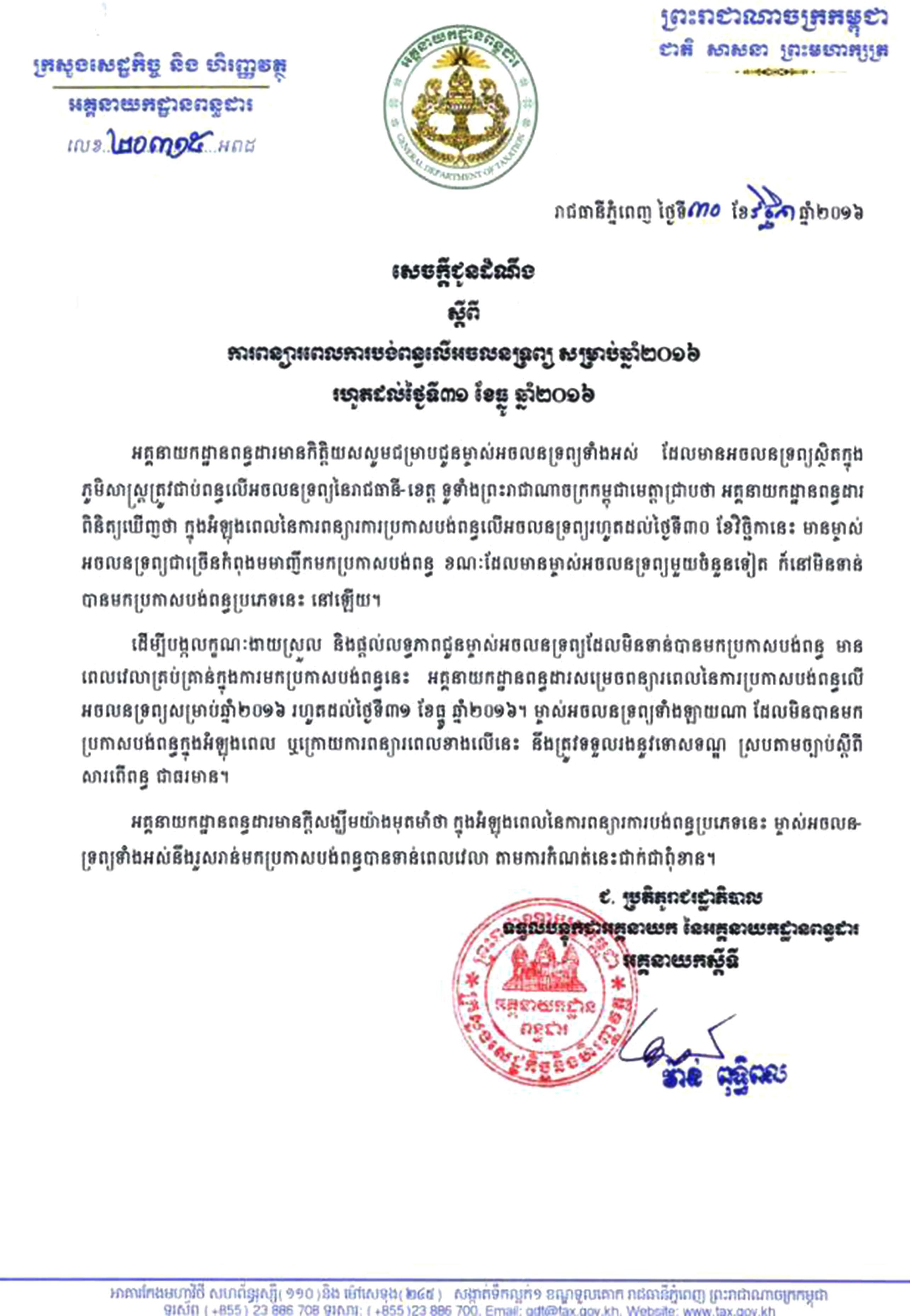 ភ្នំពេញៈ អគ្គនាយកដ្ឋានពន្ធដារ នៃក្រសួងសេដ្ឋកិច្ច និងហិរញ្ញវត្ថុ នៅថ្ងៃទី៣០ ខែវិច្ឆិកា ឆ្នាំ២០១៦ បានចេញសេចក្ដីជូនដំណឹង ស្ដីពីការពន្យារពេលបង់ពន្ធ លើអចលនទ្រព្យ សម្រាប់ឆ្នាំ២០១៦ រហូតដល់ថ្ងៃទី៣១ ខែធ្នូ ឆ្នាំ២០១៦ បន្ទាប់ពីបានពិនិត្យឃើញថា មានម្ចាស់អចលនទ្រព្យមួយចំនួន នៅតែមិនទាន់បានប្រកាសបង់ពន្ធប្រភេទនេះនៅឡើយ ខណៈម្ចាស់អចលនទ្រព្យជាច្រើន កំពុងមមាញឹកមកប្រកាសបង់ពន្ធ។ ដូច្នេះកាពន្យារនេះ ដើម្បីបង្កលក្ខណៈងាយស្រួល និងផ្តល់លទ្ធភាព ជូនម្ចាស់អចលនទ្រព្យ ដែលមិនទាន់ប្រកាសបង់ពន្ធ មានពេលវេលាគ្រប់គ្រាន់ សំរាប់ការបង់ពន្ធនេះ ។