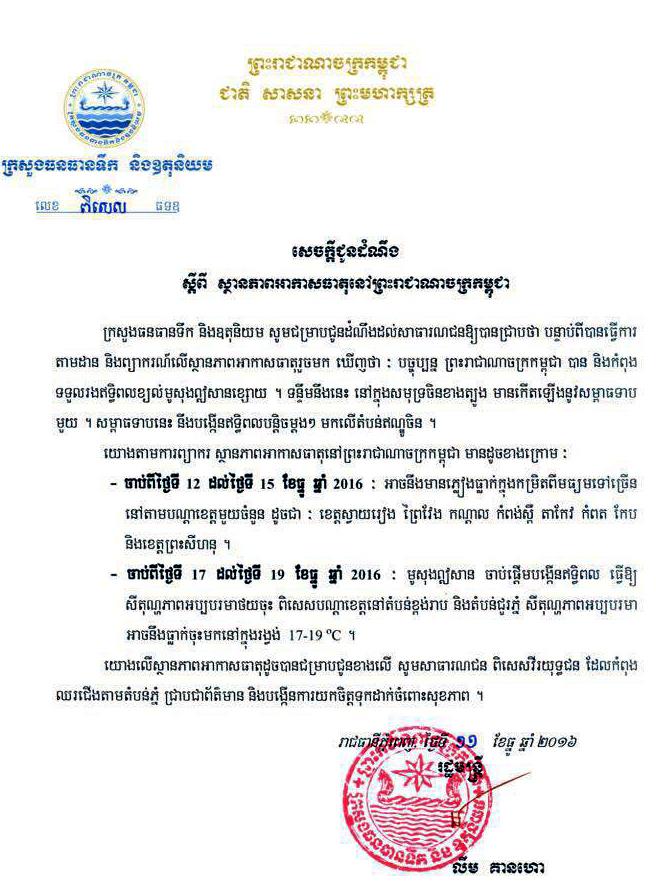 ភ្នំពេញៈ ក្រសួងធនធានទឹក និងឧតុនិយម កាលពីថ្ងៃទី១១ ខែធ្នូ ឆ្នាំ២០១៦ បានចេញសេចក្តីជូនដំណឹង ស្តីពីស្ថានភាពអាកាសធាតុនៅកម្ពុជា ដោយបញ្ជាក់ថា ដោយសាររងឥទ្ធិពលខ្យល់មូសុងឦសាន និងសម្ពាធទាប នឹងធ្វើឲ្យមានភ្លៀងធ្លាក់ ពីមធ្យមទៅច្រើន ចាប់ពីថ្ងៃទី១២ ដល់ថ្ងៃទី១៥ ខែធ្នូ ឆ្នាំ២០១៦ នៅក្នុងខេត្តចំនួន៨ រួមមាន ខេត្តស្វាយរៀង ខេត្តព្រៃវែង កណ្តាល កំពង់ស្ពឺ តាកែវ កំពត កែប និងខេត្ត ព្រះសីហនុ។