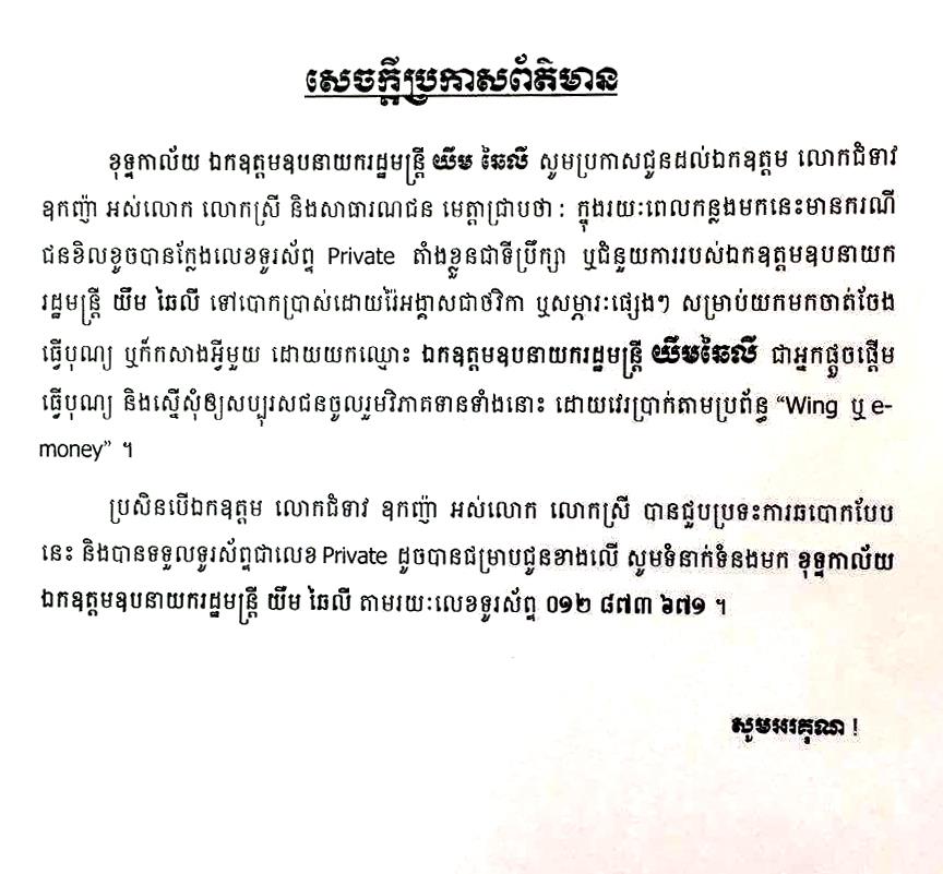 ខុទ្ទកាល័យប្រកាសថា មានជនខិលខូចយកឈ្មោះឧបនាយករដ្ឋមន្រ្តី យឹម ឆៃលី បោកប្រាស់ប្រជាពលរដ្ឋ
