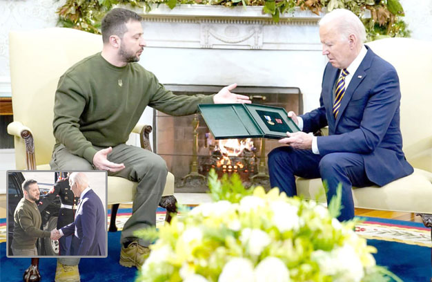 ប្រធានាធិបតីអ៊ុយក្រែនលោក ហ្សេឡិនស្គីបានប្រគល់មេដាយទាហានអ៊ុយក្រែនជូនសមភាគីអាមេរិកលោកចូបៃដិនក្នុងជំនួបទ្វេភាគី នៅទីក្រុងវ៉ាស៊ីនតោន។