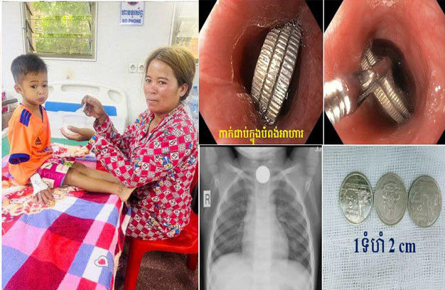 ភ្នំពេញ ៖ ក្មេងប្រុសតូចម្នាក់ បានយកកាក់ ចំនួន៣ មកបៀមលេងនៅក្នុងមាត់ រួចច្រឡំលេបចូលបណ្តាលឱ្យ ស្លាក់ជាប់បំពង់ក ជាហេតុធ្វើឱ្យក្រុមគ្រួសារភ័យឆោឡោ ប្រញាប់ដឹកបញ្ជូន មកកាន់មន្ទីរពេទ្យគន្ធបុប្ផា ដើម្បី សង្គ្រោះ និងត្រូវបានក្រុមគ្រូពេទ្យជំនាញជួយសង្គ្រោះ ដោយយកកាក់ទាំង៣ ចេញមកវិញបានដោយជោគ ជ័យ។
