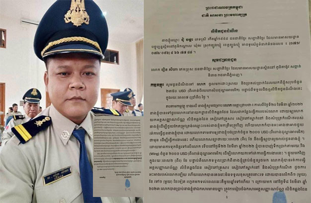 ភ្នំពេញ ៖ បុរសជាមន្ត្រីនគរបាលនាយកដ្ឋានលិខិតឆ្លងដែន នៃអគ្គនាយកដ្ឋានអត្តសញ្ញាណកម្ម ១រូប ត្រូវបាន ស្ត្រីម្នាក់ អះអាងថា បានយកប្រាក់ពីខ្លួន ចំនួន២ពាន់ដុល្លារ ដើម្បីជាថ្នូរនឹងការរត់ការកែឈ្មោះនៅក្នុងអត្តសញ្ញា ណប័ណ្ណ លិខិតឆ្លងដែន សៀវភៅគ្រួសារ សៀវភៅស្នាក់នៅ និងសំបុត្រកំណើត ប៉ុន្តែរយៈពេលជាង ១ឆ្នាំមក ហើយ នៅតែពុំបានសម្រេច ទើបខ្លួនកើតទុក្ខមិនសុខចិត្ត ទាមទារប្រាក់របស់ខ្លួនមកវិញ។
