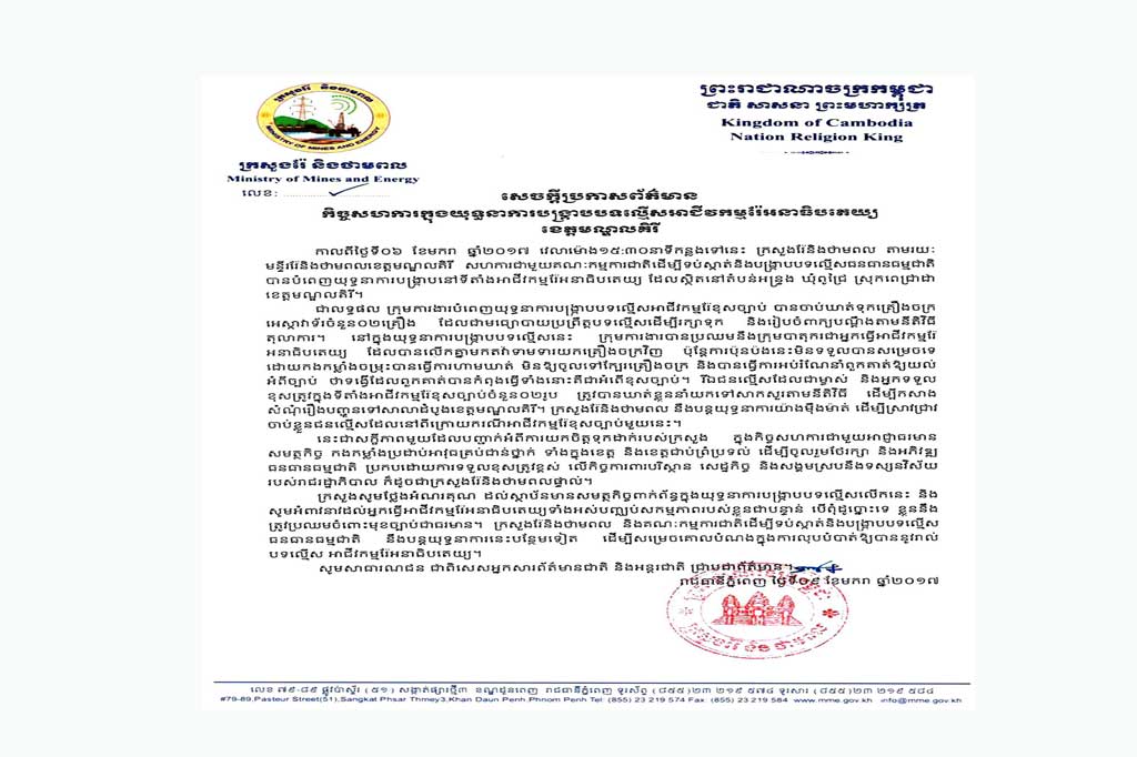 ភ្នំពេញៈ ក្រសួងរ៉ែ និងថាមពល កាលពីថ្ងៃទី០៩ ខែមករា ឆ្នាំ២០១៧ បានចេញសេចក្ដីប្រកាសព័ត៌មាន បញ្ជាក់ថា មន្ទីររ៉ែ និង ថាមពល ខេត្តមណ្ឌលគីរី កាលពីថ្ងៃទី០៦ ខែមករា ឆ្នាំ២០១៧ កន្លងទៅ ដោយមានការសហការជាមួយគណៈកម្មការជាតិ ដើម្បីទប់ស្កាត់ និងបង្ក្រាប បទល្មើសធនធានធម្មជាតិ ក៏បានបើកយុទ្ធនាការចុះបង្ក្រាបទីតាំងអាជីវកម្មរ៉ែអនាធិបតេយ្យ ខុស ច្បាប់មួយកន្លែង ស្ថិតនៅតំបន់អង្ទ្រង ឃុំពូជ្រៃ ស្រុកពេជ្រាដា ។ ជាលទ្ធផល បានដកហូតគ្រឿងចក្រ២គ្រឿង និងជនពាក់ព័ន្ធ ចំនួន ២នាក់ទៀត ដើម្បីកសាងសំណុំរឿង បញ្ជូនទៅតុលាការ បើទោះបីនៅពេលនោះ មានក្រុមបាតុករមួយចំនួន ដែលជា ក្រុមអ្នកធ្វើអាជីវកម្មរ៉ែខុសច្បាប់ជាមួយគ្នា បានលើកគ្នាមកតវា ទាមទារយកគ្រឿង ចក្រទាំងនោះទៅវិញក៏ដោយ ក៏ត្រូវបាន កម្លាំងចម្រុះ ធ្វើការទប់ស្កាត់ និងអប់រំណែនាំអំពីបទល្មើសខុសច្បាប់ ព្រមទាំងបញ្ជាឲ្យរំសាយទៅវិញ ៕