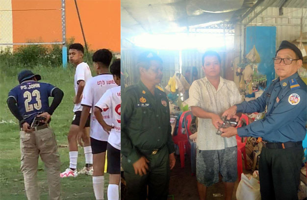 ខេត្តតាកែវ ៖ យុវជន២ក្រុម បានប្រកួតបាល់ទាត់ជាមួយគ្នា លុះក្រោយមកបានកើតមានជម្លោះ ស្រាប់តែមាន យុវជនម្នាក់ បានដកកាំភ្លើងមកគំរាម តែត្រូវបានគ្រូបង្វឹកចូលមកឃាត់ និងដកកាំភ្លើងសៀតចង្កេះទុកតែត្រូវគេ ថតបានបង្ហោះ ធ្វើឱ្យមានការរិះគន់ផ្អើលពេញបណ្តាញសង្គម ខណៈដែលអ្នកសៀតកាំភ្លើងនៅចង្កេះក្នុងរូប ភាពនោះ គឺមិនមែនជាម្ចាស់កាំភ្លើងទេ។ ចំណែកម្ចាស់ពិតប្រាកដ បានរត់គេចខ្លួនបាត់ និងកំពុងត្រូវបានកម្លាំង អាវុធហត្ថស្រាវជ្រាវតាមចាប់ខ្លួន។