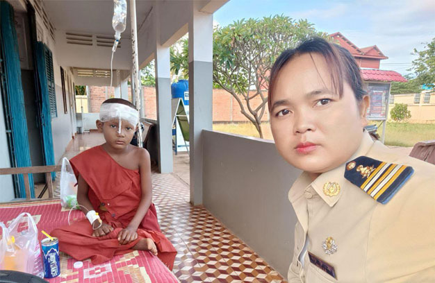 សាមណេរដែលរងរបួស មានព្រះនាម អុក ទីណា ព្រះជន្ម៩វស្សា រងរបួសបែកថ្ងាស (ដេរ៥ថ្នេរ) កំពុងសម្រាក ព្យាបាលនៅមណ្ឌលសុខភាពស្រីស្នំ។ ចំណែកព្រះចៅអធិការ មានព្រះនាម បឿត សុម៉ៅសុវណ្ណរ៉ា ជាចៅអធិ ការវត្តវេឡុវ័នដោកពោយ គោកក្រោល ស្ថិតក្នុងភូមិឫស្សីសាញ់ ឃុំជ្រោយនាងងួន ស្រុកស្រីស្នំ។