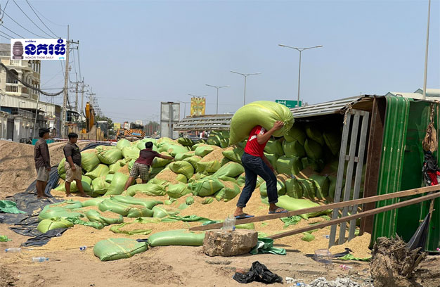 ភ្នំពេញ ៖ រថយន្តយីឌុបដឹកស្រូវ រាប់រយបាវ ទម្ងន់ប្រមាណជាង៣០តោន ១គ្រឿង បានបុកគ្នាជាមួយរថយន្តបែនដឹកខ្សាច់ ១គ្រឿង យ៉ាងពេញទំហឹង នៅវេលាទៀបភ្លឺ បណ្តាលឱ្យរងការខូចខាតទាំងសងខាង តែសំណាងល្អ មិនបង្កឱ្យមនុស្សណាម្នាក់រងគ្រោះថ្នាក់ធ្ងន់ធ្ងរឡើយ រហូតដល់ព្រឹកឡើង ខាងរថយន្តដឹកស្រូវ បានយករថយន្តស្ទូច ១គ្រឿង ទៅស្ទូចបង្ហើបកន្ទុយរ៉ឺម៉ករថយន្តដឹកស្រូវនោះ ដើម្បីប្តូរក្បាលរថយន្តសណ្តោងថ្មី ស្រាប់តែដាច់តម្ពក់ដងស្ទូច បណ្តាលឱ្យក្រឡាប់ចាក់ស្រូវចោលពេញដីតែម្តង។