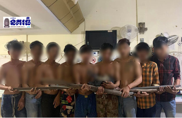 ភ្នំពេញ ៖ ក្មេងទំនើង ១ក្រុម ប្រដាប់ដោយដំបងនិងដុំថ្មគ្រប់ដៃ បាននាំគ្នាចេញមកឈរពេញផ្លូវ បំណងចាំវាយគូសត្រូវ តែគាប់ជួនត្រូវសមត្ថកិច្ចល្បាតប្រទះឃើញ ប្រាប់ឱ្យបំបែកគ្នាចូលទៅដេក កុំឈរពេញផ្លូវបែបនេះទៀត រួចសមត្ថកិច្ចល្បាតបន្តល្បាតទៅមុខទៀត ស្រាប់តែមួយសន្ទុះក្រោយមក សមត្ថកិច្ចត្រឡប់មកវិញ ឃើញក្រុមក្មេងស្ទាវ មិនព្រមបំបែកហ្វូង ដោយនៅតែឈរចាំវាយគូទំនាស់ដដែល ទើបឃាត់ខ្លួនក្រុមក្មេងស្ទាវទាំងនោះ ចំនួន ៩នាក់ នាំយកទៅសាកសួរ។
