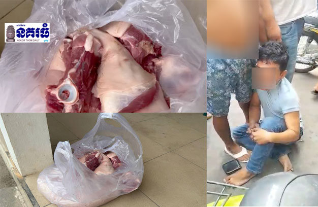 ភ្នំពេញ ៖ ជនសង្ស័យម្នាក់ បានជិះម៉ូតូមកឈប់ក្បែរតូបលក់សាច់ជ្រូក ១កន្លែង រួចចូលទៅលើកសាច់ជ្រូក ១ថង់ ទម្ងន់៣០គីឡូក្រាម ដាក់លើម៉ូតូ បម្រុងរត់គេច តែត្រូវម្ចាស់គេឃើញទាន់ ស្រែកឆោឡោ ចាប់ក្របួចជាប់ ប្រគល់ឱ្យសមត្ថកិច្ចនាំយកទៅចាត់ការតាមច្បាប់។
