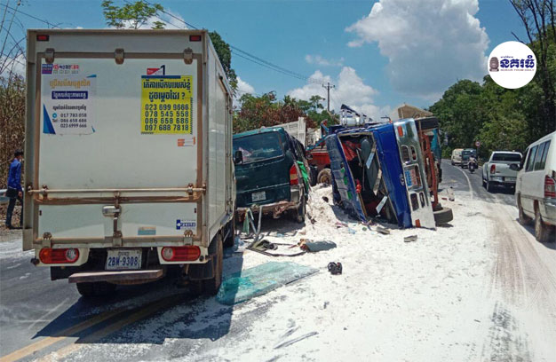 ខេត្តកំពង់ស្ពឺ ៖ រថយន្តបែនដឹកខ្សាច់ ១គ្រឿង បើកឡើងចំណោតមិនរួច រអិលថយក្រោយ បុករះរថយន្ត ៣ គ្រឿង បណ្តាលឱ្យក្រឡាប់ និងធ្វើឱ្យរងរបួសមនុស្សចំនួន៨នាក់ (ស្រី៦)។