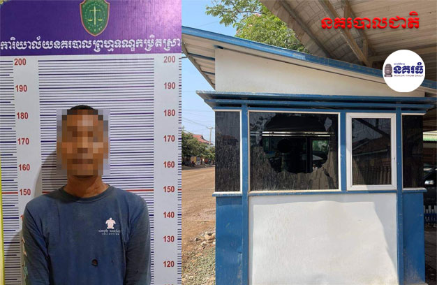 ខេត្តបន្ទាយមានជ័យ ៖ ជនសង្ស័យម្នាក់ នៅសុខៗបានយកដុំថ្មគប់កញ្ចក់ប៉ុស្តិ៍យាមរបស់នគរបាល បណ្តាលឱ្យបែក រួចរត់គេចខ្លួន តែត្រូវសមត្ថកិច្ចស្រាវជ្រាវឃាត់ខ្លួនបាន នាំយកមកចាត់ការតាមច្បាប់។