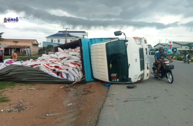 ខេត្តកំពង់ស្ពឺ ៖ រថយន្តកូរ៉េដឹកជី ១គ្រឿង ខណៈដែលបើកចេញពីផ្លូវលំ ឡើងផ្លូវជាតិ មិនរួច បណ្តាលឱ្យផ្អៀងក្រឡាប់ផ្ងារជើង តែសំណាងល្អ មិនបង្កឱ្យអ្នកណាម្នាក់រងរបួសនោះឡើយ។
