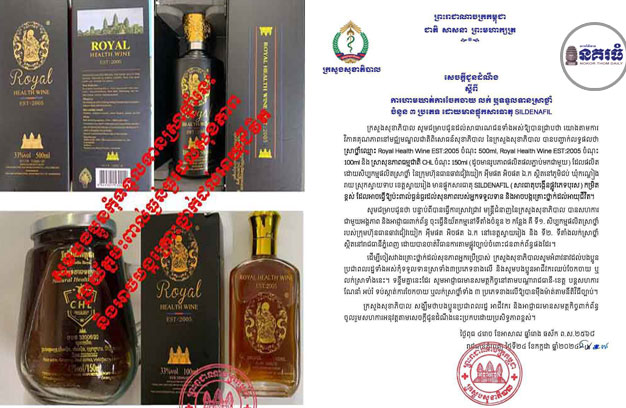 យោងតាមសេចក្តីជូនដំណឹងរបស់ក្រសួងសុខាភិបាល ស្តីពីការហាមឃាត់ការចែកចាយលក់ ឬទទួលទានស្រាថ្នាំ ចំនួន ៣ប្រភេទ ដោយមានផ្ទុកសារធាតុ SILDENAFIL មានខ្លឹមសារទាំងស្រុងថា ក្រសួងសុខាភិបាល សូមជម្រាបជូនដល់សាធារណជនទាំងអស់ ឱ្យបានជ្រាបថា យោងតាមការវិភាគគុណភាពនៅមជ្ឈមណ្ឌលជាតិពិសោធន៍សុខាភិបាល នៃក្រសួងសុខាភិបាល បានបញ្ជាក់លទ្ធផលថា ស្រាថ្នាំឈ្មោះ Royal Health Wine EST:2005 ចំណុះ ៥០០មល Royal Health Wine EST:2005 ចំណុះ ១០០មល និង ស្រាសុខភាពធម្មជាតិ CHL ចំណុះ ១៥០មល (ដូចមានរូបភាពផលិតផលភ្ជាប់មកជាមួយ) ដែលផលិតដោយសិប្បកម្មផលិតស្រាថ្នាំ នៃក្រុមហ៊ុនធានឆាវជៀវយៀក អ៊ឹមផត អិចផត ឯ.ក ស្ថិតនៅភូមិជប់ ឃុំកណ្តៀងរាយ ស្រុកស្វាយជ្រំ ខេត្តស្វាយរៀង មានផ្ទុកសារធាតុ SILDENAFIL (សារធាតុបង្កើនផ្លូវភេទបុរស) កម្រិតខ្ពស់ ដែលអាចធ្វើឱ្យប៉ះពាល់ធ្ងន់ធ្ងរដល់សុខភាពរបស់អ្នកទទួលទាន និងអាចបង្កគ្រោះថ្នាក់ដល់អាយុជីវិត។