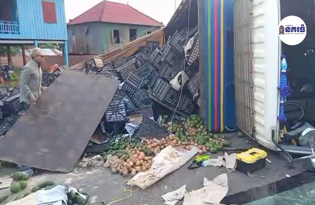 ខេត្តព្រៃវែង ៖ រថយន្តទ្រុងធុនធំ ដឹកផ្លែឈើ ១គ្រឿង បើកគេចជង្ហុក បណ្តាលឱ្យក្រឡាប់ផ្ងារជើង ចាក់ផ្លែឈើចោលពេញផ្លូវ សំណាងល្អមិនបង្ករបួសដល់មនុស្ស។
