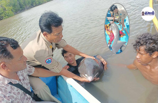 ខេត្តកោះកុង ៖ មន្ត្រីសង្កាត់រដ្ឋបាលជលផលស្មាច់មានជ័យ និងប្រជាសហគមន៍នេសាទពាមក្រសោប បានជួយសង្គ្រោះសត្វផ្សោត ១ក្បាល ដែលជាប់ឫសដើមកោងកាង ក្រោយផ្ទះប្រជាពលរដ្ឋ។