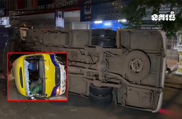ភ្នំពេញ ៖ បុរសម្នាក់ បានបើកបររថយន្តដឹកអ្នកដំណើរ ១គ្រឿង ក្នុងល្បឿនលឿន ដោយខ្វះការប្រុងប្រយ័ត្ន រេចង្កូតទៅបុករបាំងថ្មពុះចែកទ្រូងផ្លូវ បាក់១កង់ បណ្តាលឱ្យរថយន្តក្រឡាប់ផ្ងារជើង សំណាងល្អមិនបង្កឱ្យមានគ្រោះថ្នាក់ដល់មនុស្សណាម្នាក់ឡើយ ហើយក្រោយកើតហេតុភ្លាមៗ បុរសជាអ្នកបើកបរ បានចុះរត់គេចខ្លួនបាត់។