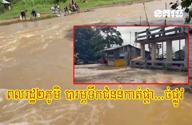 ខេត្តបន្ទាយមានជ័យ ៖ ទឹកជំនន់ ហក់ឡើងខ្លាំង ធ្វើឱ្យប្រជាពលរដ្ឋព្រួយបារម្ភទឹកហូរច្រោះដាច់ផ្លូវ ធ្វើដំណើរមិនកើត ពីភូមិចំណោម ទៅភូមិសាយម៉ន ក្នុងឃុំចំណោម កាលពីថ្ងៃទី២៣ ខែតុលា ឆ្នាំ២០២៤ ស្រុកមង្គលបុរី ខេត្តបន្ទាយមានជ័យ។