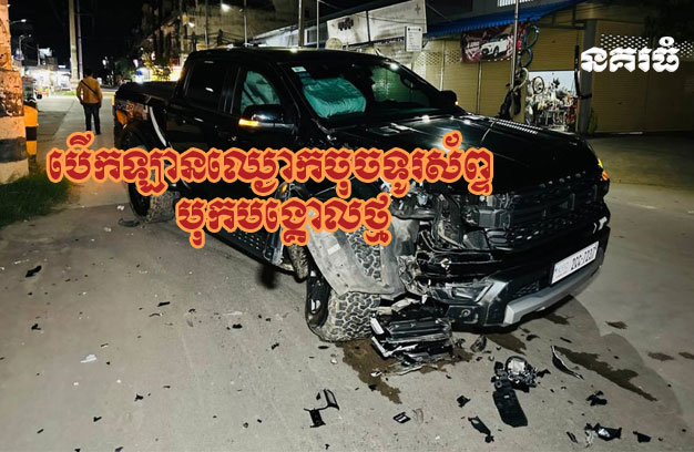 ភ្នំពេញ ៖ បុរសម្នាក់ បានបើករថយន្តទំនើប ១គ្រឿង រវល់តែឈ្ងោកចុចទូរស័ព្ទ មិនបានមើលផ្លូវ ធ្វើឱ្យរេចង្កូតរថយន្តទៅបុកបង្គោលថ្មអមបង្គោលភ្លើង ពេញទំហឹង បណ្តាលឱ្យរងការខូចខាតរថយន្តផ្នែកខាងមុខយ៉ាងដំណំ។
