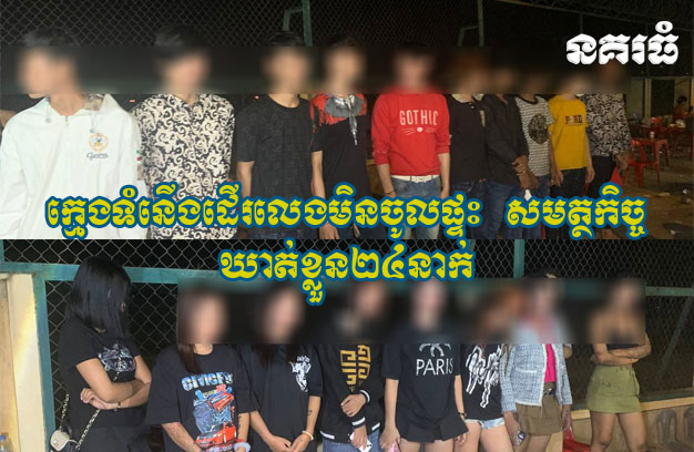 ភ្នំពេញ ៖ ក្មេងទំនើងប្រុសស្រី ចំនួន២៤នាក់ ដើរលេងដាច់យប់ មិនចូលផ្ទះ ត្រូវបានសមត្ថកិច្ចធ្វើការសាកសួរ និងប្រាប់ឱ្យបំបែកផ្លូវគ្នាត្រឡប់ទៅផ្ទះវិញ។