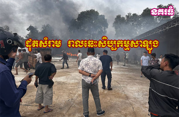 ភ្នំពេញ ៖ ថៅកែសិប្បកម្មផលិតសាឡុង ១កន្លែង បានប្រើឱ្យកម្មករដុតប្រមូលសំរាម នៅក្បែររោងស្តុកសាឡុង និងឈើឆ្អឹងសាឡុង ស្រាប់តែខណៈភ្លើងកំពុងឆេះសំរាមខ្លាំង មានខ្យល់បក់មកខ្លាំងដែរ ជាហេតុធ្វើឱ្យកម្ទេចផ្កាភ្លើងហើរធ្លាក់ចូលទៅក្នុងរោង បង្កឱ្យមានការឆាបឆេះយ៉ាងសន្ធោសន្ធៅ ផ្អើលដល់សមត្ថកិច្ចបញ្ជូនរថយន្តពន្លត់អគ្គិភ័យ ចេញអន្តរាគមន៍បាញ់ទឹកពន្លត់ភ្លាមៗ។