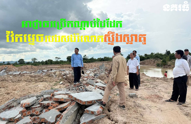 ខេត្តតាកែវ ៖ របងថ្ម ប្រវែង១៤៨ម៉ែត្រ ដែលបានសាងសង់រំលោភលើដីចំណីស្ទឹងស្លាគូ ស្ថិតក្នុងភូមិត្រពាំងពោធិ៍ ឃុំជាងទង ស្រុកត្រាំកក់ គិតត្រឹមវេលាម៉ោង ៤និង១៦នាទីរសៀល ថ្ងៃទី១៣ ខែតុលា ឆ្នាំ២០២៥ ត្រូវបានអាជ្ញាធរប្រើកណ្តាប់ដៃដែក វាយកម្ទេចចោលទាំងស្រុង។
