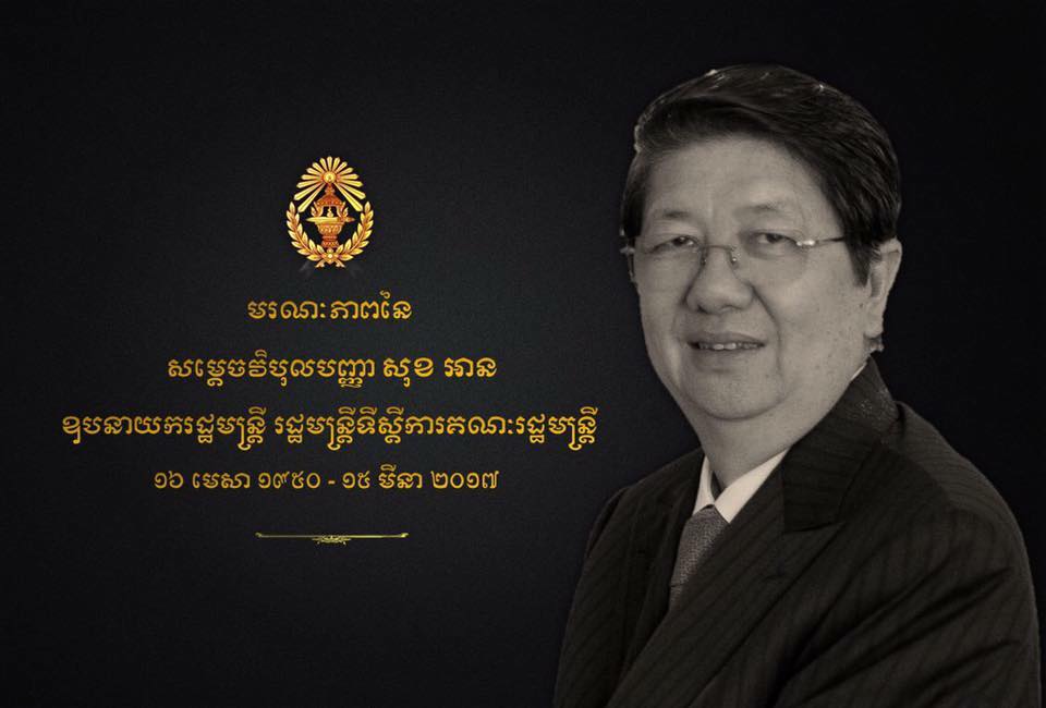 សម្តេចសុខ អាន ឧបនាយករដ្ឋមន្រ្តី រដ្ឋមន្រ្តីទទួលបន្ទុកទីស្តីការគណៈរដ្មមន្រ្តី បានទទួលមរណភាពហើយ កាលពីវេលាម៉ោង6និង32នាទីល្ងាច ថ្ងៃទី15 ខែមីនា ឆ្នាំ2017 ដោយរោគាពាធ ក្នុងជន្មាយុ66ឆ្នាំ ៕