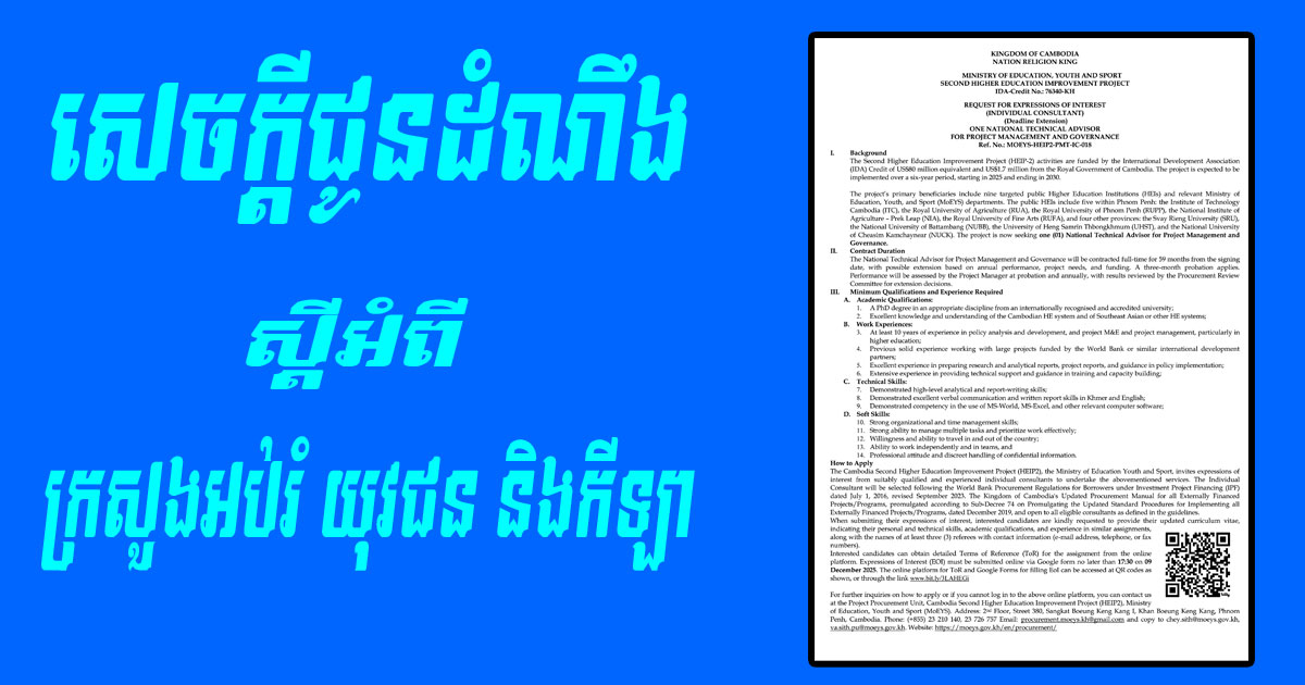 Homeព័ត៌មានជាតិសេចក្តីជូនដំណឹង ស្តីអំពី ក្រសួងអប់រំ យុវជន និងកីឡា ព័ត៌មានជាតិ សេចក្តីជូនដំណឹង ស្តីអំពី ក្រសួងអប់រំ យុវជន និងកីឡា By Davin December 4, 2025 0 0 Share FacebookTwitterPinterestWhatsApp RELATED ARTICLES ព័ត៌មានជាតិ សារមន្ទីរតេជោសន្តិភាព រូបមីន PMN-2 បញ្ចប់ការងារចាក់បេតុងទាំងស្រុង December 1, 2025 ព័ត៌មានជាតិ ព្រះមហាក្សត្រកម្ពុជា យាងទៅបារាំង ចូលរួមកិច្ចប្រជុំបណ្ឌិត្យសភាវិទ្យាសាស្ត្រ December 1, 2025 ព័ត៌មានជាតិ កសាងផ្ទះយើងវិញ ! ក្រុមកឹម សុខា ប្រកាសរួបរួមគ្នាក្នុងគណបក្សមួយ December 1, 2025