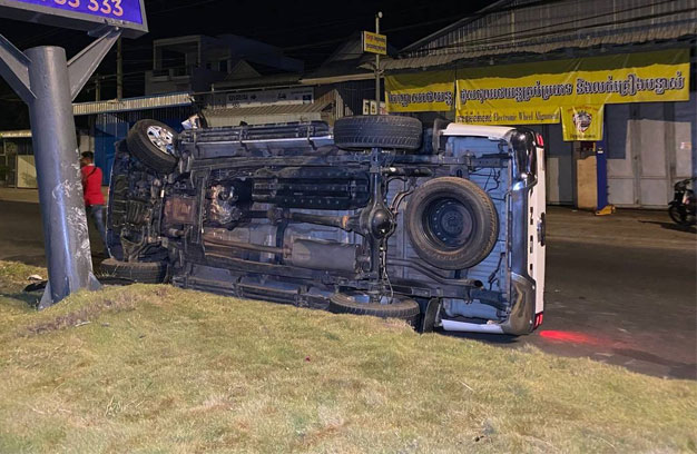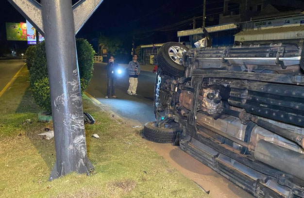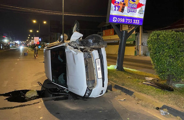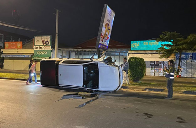 ភ្នំពេញ ៖ បុរសម្នាក់ បានបើករថយន្ត ១គ្រឿង ក្នុងល្បឿនលឿន មិនប្រយ័ត្ន រេចង្កូតឡើងសួនផ្លូវ រួចបន្តទៅបុកបង្គោលប៉ាណូផ្សាយពាណិជ្ជកម្ម បាក់ទ្រេត ១ដើម ចំណែករថយន្ត ក្រឡាប់ផ្ងារជើង ខូចខាតធ្ងន់។