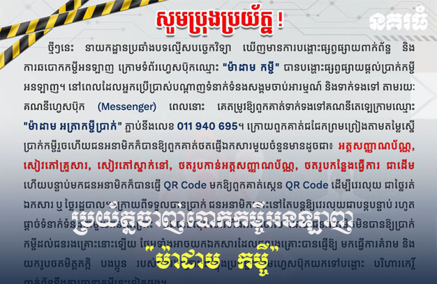 ភ្នំពេញ ៖ នាយកដ្ឋានប្រឆាំងបទល្មើសបច្ចេកវិទ្យា បានប្រកាសថា ថ្មីៗនេះ នាយកដ្ឋានប្រឆាំងបទល្មើសបច្ចេកវិទ្យា ឃើញមានការបង្ហោះផ្សព្វផ្សាយពាក់ព័ន្ធនឹងការឆបោកកម្ចីអនទ្បាញ ក្រោមទំព័រហ្វេសប៊ុក ឈ្មោះ “ម៉ាដាម កម្ចី” ។