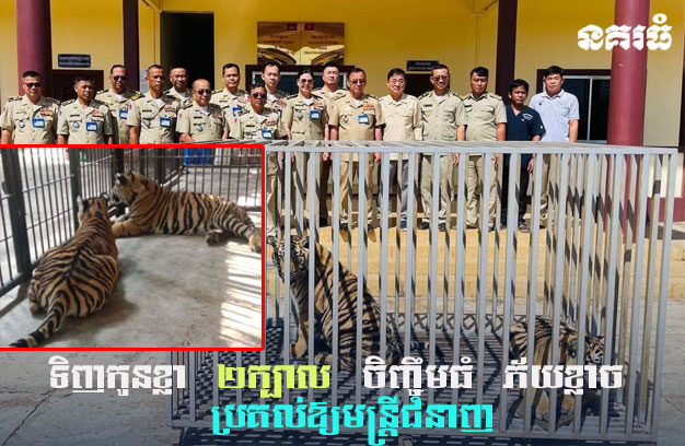 ខេត្តមណ្ឌលគិរី ៖ សត្វខ្លាដំបង ចំនួន២ក្បាល ដែលត្រូវបានទិញមកពីបរទេស ចិញ្ចឹមតាំងពីតូច លុះកាន់តែធំឡើង ម្ចាស់មានការព្រួយបារម្ភពីសុវត្ថិភាព ក៏សម្រេចចិត្តប្រគល់ជូនសមត្ថកិច្ច ដើម្បីប្រគល់បន្តទៅមន្ត្រីជំនាញ បញ្ជូនទៅកាន់សួនសត្វភ្នំតាម៉ៅ ដើម្បីមើលថែបន្ត។