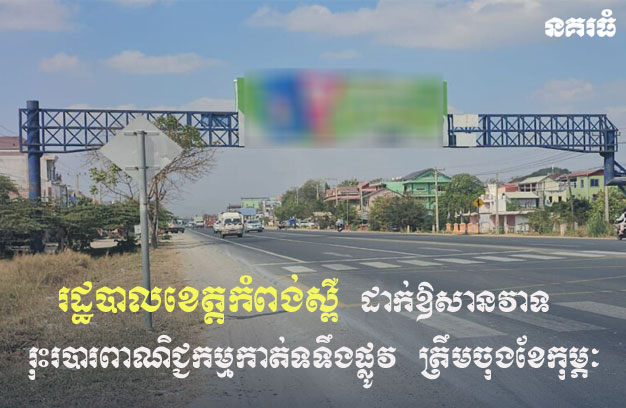 ខេត្តកំពង់ស្ពឺ ៖ រដ្ឋបាលខេត្តកំពង់ស្ពឺ បានកំណត់ឱ្យមានការរុះរើផ្ទាំងផ្សព្វផ្សាយពាណិជ្ជកម្មរបារកាត់ទទឹងផ្លូវ  (OVERHEAD PASS) និងផ្ទាំងផ្សព្វផ្សាយពាណិជ្ជកម្មជើងមួយ (UNIPOLE BILLBOARD) តាមបណ្តោយផ្លូវជាតិលេខ៤ ចាប់ពីចំណុចភូមិរលាំងសង្កែ សង្កាត់សុព័រទេព ដល់ចំណុចស្ពានធ្នួសលួង ស្ថិតក្នុងភូមិព្រៃស្លឹក សង្កាត់ច្បារមន ក្រុងច្បារមន ខេត្តកំពង់ស្ពឺ ត្រឹមចុងខែកុម្ភៈ ឆ្នាំ២០២៦ ខាងមុខនេះ គោលបំណងដើម្បីរៀបចំស្ថាបនាសួនច្បារ លំហចំណតសាធារណៈ និងពង្រីកទទឹងផ្លូវជាតិលេខ៤។