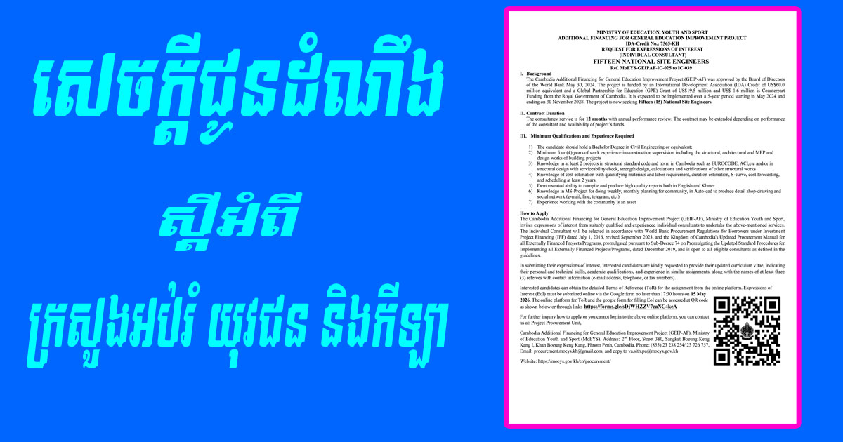 Homeព័ត៌មានជាតិសេចក្តីជូនដំណឹង ស្តីអំពី ក្រសួងអប់រំ យុវជន និងកីឡា ព័ត៌មានជាតិសេចក្តីជូនដំណឹងព្រឹត្តិការណ៍សង្គម សេចក្តីជូនដំណឹង ស្តីអំពី ក្រសួងអប់រំ យុវជន និងកីឡា By Davin April 28, 2026 0 0 Share FacebookTwitterPinterestWhatsApp RELATED ARTICLES ព័ត៌មានជាតិ សេចក្តីជូនដំណឹង ស្តីអំពី ក្រសួងអប់រំ យុវជន និងកីឡា April 29, 2026 ព័ត៌មានជាតិ កម្ពុជា ទទួលស្វាគមន៍ប្រតិភូព្រះសង្ឃវត្តសៅលីញ ១៦អង្គ April 29, 2026 ព័ត៌មានជាតិ ច្បាប់កាតព្វកិច្ចយោធា គណៈរដ្ឋមន្ត្រីអនុម័ត នឹងដាក់ឲ្យអនុវត្តជាការប្រញាប់ April 25, 2026