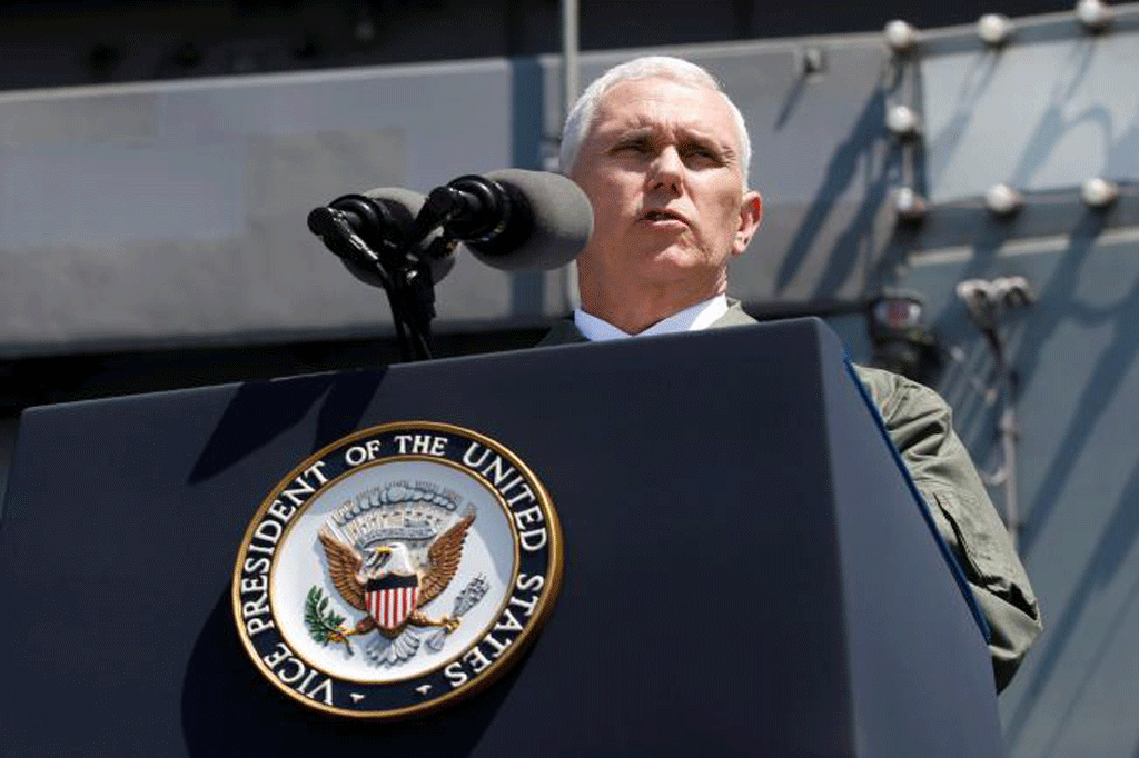 ថ្លែងនៅលើនាវាដឹកយន្តហោះចម្បាំង USS Ronald Reagan ដែលថ្មីៗនេះទទួលបានការជួសជុលនៅកំពង់ផែរបស់ខ្លួននៅ Yokosuka លោក Pence បានលើកឡើងគោលបំណងរបស់សហរដ្ឋអាមេរិកនៅតែឥតងាករេក្នុងការប្រឈមមុខនឹងការគំរាមកំហែងដែលធ្វើឡើងដោយកូរ៉េខាងជើងតាមរយៈការធ្វើតេស្តបាញ់មីស៊ីលនិងនុយក្លេអែរដែលរឹងទទឹងជាមួយនិងការដាក់ទណ្ឌកម្មរបស់អង្គការសហប្រជាជាតិ ។