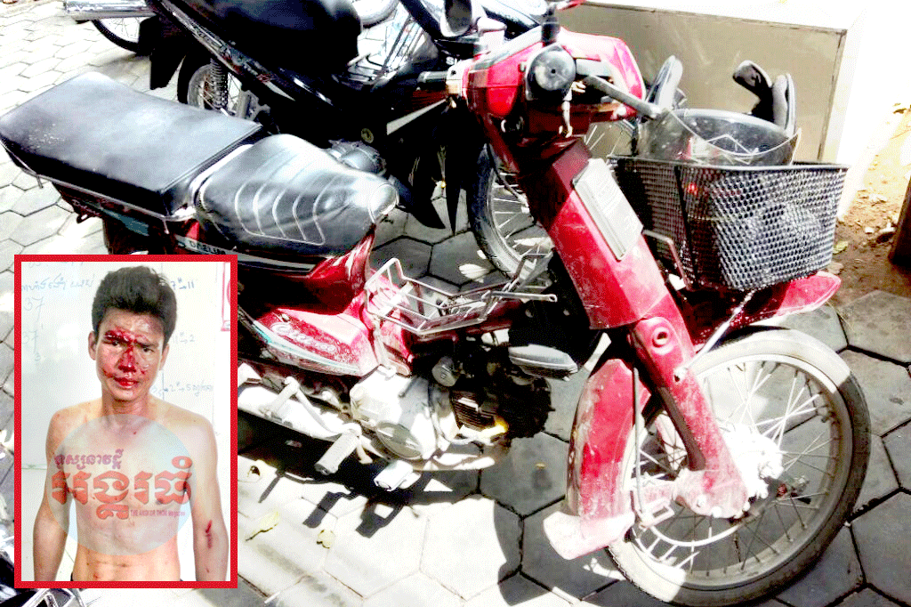 ភ្នំពេញ ៖ បុរសម្នាក់ត្រូវបានប្រជាពលរដ្ឋដេញតាមចាប់ក្របួចជាប់ និងស្វាគមន៍ម្នាក់មួយដៃបណ្ដាលឲ្យរងរបួសបែកមុខបែកមាត់ ហូរឈាមស្រោចពេញមុខ បន្ទាប់ពីរូបគេបានធ្វើសកម្មភាពយកម៉ូតូសងកូរ៉េទៅផ្ញើ ចង់បន្លំសំបុត្រយកម៉ូតូថ្មី ។