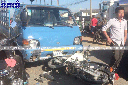 ភ្នំពេញ ៖ រថយន្តហុីយ៉ាន់ដាយទ្រុងមួយគ្រឿង បើកបរវ៉ាជែងគេឯងចូលទៅគន្លងផ្លូវអថិភាពរបស់គេម្ខាងទៀត ជ្រុលទៅបុកម៉ូតូច្រាសទិស កល់កៀបជាប់ពីក្រោមរថយន្ត រងរបួសធ្ងន់ម្នាក់ កាលពីវេលាម៉ោង៧និង៣០នាទីព្រឹក ថ្ងៃទី១៥ ខែមិថុនា ឆ្នាំ២០១៧ ស្ថិតនៅលើកំណាត់ផ្លូវជាតិលេខ៤ ភូមិព្រៃស្វាយ សង្កាត់ចោមចៅ ខណ្ឌពោធិ៍សែនជ័យ ។