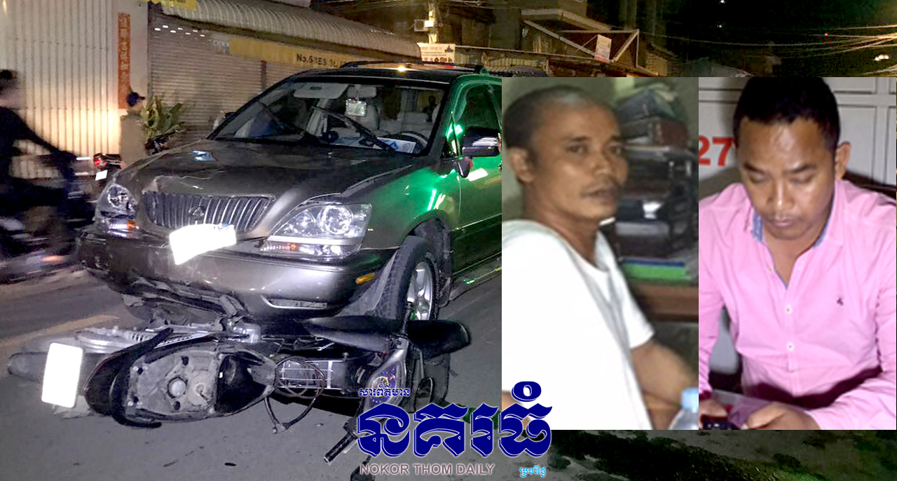 ភ្នំពេញ ៖ មន្រ្តីអាវុធហត្ថខណ្ឌចំការមន បើករថយន្តបុកម៉ូតូរងរបួសធ្ងន់២នាក់ និងស្រាល​ម្នាក់​ បែរជាបុរស២នាក់ ជិះម៉ូតូមួយគ្រឿង ក្នុងស្ថានភាពស្រវឹងមកដល់ បានស្រែកថាចោរៗ ត្រូវសមត្ថកិច្ចឃាត់ខ្លួនយកទៅសួរនាំ បង្កឲ្យមានការភ្ញាក់ផ្អើលកាលពីវេលាម៉ោង​១១និង២០នាទីយប់ ថ្ងៃទី០២ ខែកក្កដា ឆ្នាំ ២០១៧ នៅចំណុចផ្លូវ៤៨៤ កែងផ្លូវ៩៩ ស្ថិតនៅភូមិ៤ សង្កាត់ផ្សារដើមថ្កូវ ខណ្ឌចំការមន ។