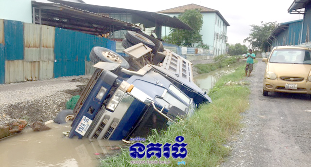 ភ្នំពេញ ៖ រថយន្តបែនកង់៦មួយគ្រឿង ខណៈដែលចង់បើតាមផ្លូវកាត់អមមាត់ប្រឡាយ ក្នុងសភាពទើបចាក់កំទេចថ្មហើយថ្មីៗ ស្រាប់តែផុងដីទៅមុខលែងរួច ខំប្រឹងរោទ៍ ធ្វើឲ្យដីបាក់ស្រុត ធ្លាក់រថយន្តក្រឡាប់ចូលទៅក្នុងប្រឡាយទឹកស្អុយ សំណាងល្អអ្នកបើកបរលោតរួច អត់មានគ្រោះថ្នាក់ ។ ហេតុការណ៍ខាងលើកើតឡើងកាលពីវេលាម៉ោង៨និង១៥នាទីព្រឹក ថ្ងៃទី២០ ខែកក្កដា ឆ្នាំ២០១៧ ស្ថិតនៅតាមផ្លូវ៤ម៉ែត្រ អមមាត់ប្រឡាយទឹកស្អុយ មុខរោងចក្រកាត់ដេរ ស្កាយហាយ ភូមិព្រៃព្រីងជើង សង្កាត់ចោមចៅ ខណ្ឌពោធិ៍សែនជ័យ ។