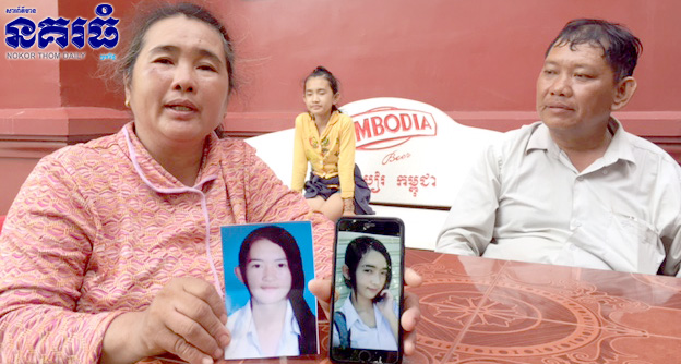 ភ្នំពេញ ៖ ស្រ្តីចំណាស់ម្នាក់រួមដំណើរជាមួយប្តី ក្នុងទឹកមុខស្រពាប់ស្រពោន ទោះជាយំក៏មិនចេញ សើចក៏លែងសម បន្ទាប់ពីបាត់កូនស្រីវ័យ១៥ឆ្នាំ ចាកចេញពីផ្ទះគ្មានដំណឹងសូន្យឈឹងអស់រយៈពេល១៨ថ្ងៃ ឪពុកម្តាយខំដើរស្វែងរកឡោះងចង់ខ្សោះខ្យល់ ខ្វាយខ្វល់ពីសុវត្ថិភាពកូនស្រី ខណៈដែលស្ថិតនៅក្នុងវ័យសិក្សា រហូតដល់ល្ងាចថ្ងៃទី២២ ខែកក្កដា ឆ្នាំ២០១៧ ក្រុមគ្រួសារកាន់រូបថត មកប្តឹងអាជ្ញាធរសមត្ថកិច្ចចោមចៅ ឲ្យជួយស្រាវជ្រាវ និងដាក់ការសង្ស័យ មានអ្នកល្បួងនាំ។