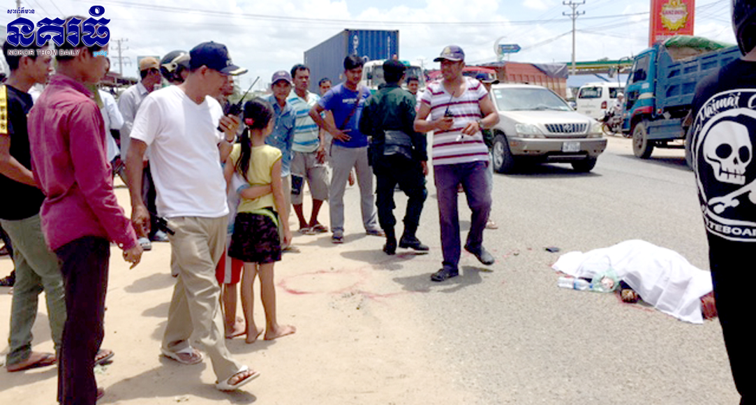 រថយន្តកូរ៉េដឹកឥដ្ឋ បើកបុកម៉ូតូពីក្រោយ ដួលកិនស្រ្តីម្នាក់ស្លាប់