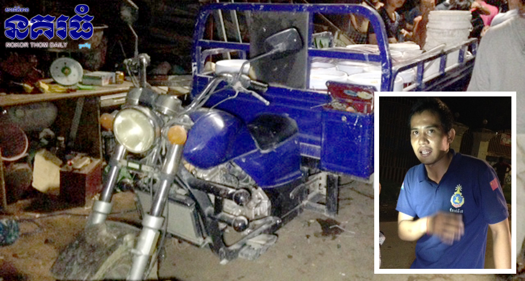 ភ្នំពេញ ៖ បុរសម្នាក់ស្រវឹងស្រាជិះម៉ូតូស្កុបពី មួយគ្រឿង បោះពួយយ៉ាងលឿន ក៏ជ្រុលទៅបុកពីក្រោយរ៉ឺម៉កដឹកអេតចាយ ដែលបត់ឆ្វេងឆ្លងផ្លូវអត់ស៊ីញ៉ូ បណ្តាលឲ្យម៉ូតូរងការខូចខាត ចំណែកឯរ៉ឺម៉កម៉ូតូបានបើករត់ចូលទៅក្នុងឃ្លាំងស្តុបអេតចាយបាត់ស្រមោល ហេតុការណ៍នេះកើតឡើងកាលពីវេលាម៉ោង៨យប់ ថ្ងៃទី១១ ខែកញ្ញា ឆ្នាំ២០១៧ ត្រង់ចំណុចខាងមុខឃ្លាំងស្តុបអេតចាយមួយកន្លែង តាមណ្តោយផ្លូវ២៥៧ ផ្លូវដីថ្មី ស្ថិតក្នុងសង្កាត់ភ្នំពេញថ្មី ខណ្ឌសែន