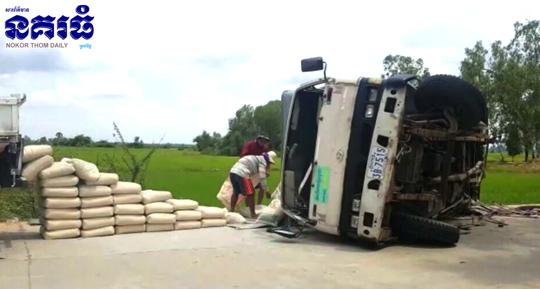 រថយន្តដឹកស៊ីម៉ងត៍ បើកប៉ះថ្មស្ទាក់ផ្លូវ ដាច់កង់ក្រោយទាំង២ ក្រឡាប់ចាក់សុីម៉ងត៍ចោល