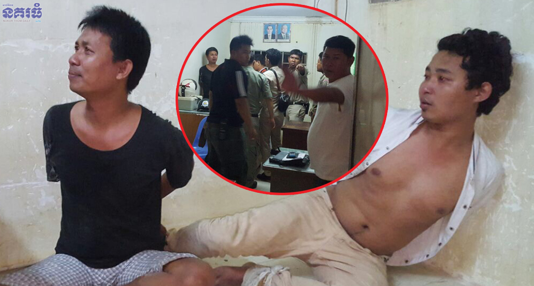 ភ្នំពេញ ៖ បុរស២នាក់ត្រូវបានកម្លាំងសមត្ថកិច្ចចុះឃាត់ខ្លួនជាក់ស្តែង យកមកសាកសួរក្រោយពីផឹកស៊ីស្រវឹងបានរពិសដៃទៅចាប់បងប្អូនម្ចាស់ហាង និងអុកឡុកក្នុងហាងរបស់គេ។ហេតុការណ៍នេះបង្ករភ្ញាក់ផ្អើកាលពីម៉ោង១៩និង៣០នាទី ព្រលប់ថ្ងៃទី១១ ខែវិច្ឆិកា ឆ្នាំ២០១៧ នៅហាងផឹកស៊ីយីហោ (ជេ សាច់អាំងនិងស៊ុប) ដែលមានទីតាំងភូមិត្រពាំងថ្លឹង១ សង្កាត់ចោមចៅ១ ខណ្ឌពោធិ៍សែនជ័យ។