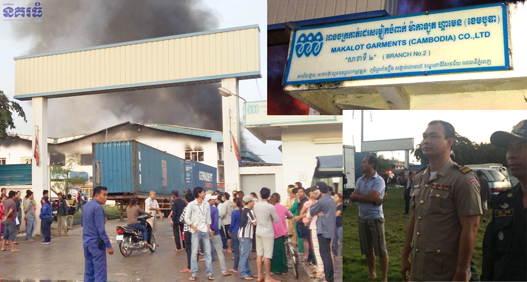 ភ្នំពេញ ៖ រោងចក្រកាត់ដេរសំលៀកបំពាក់ ម៉ាកាឡូត ហ្គាមិន ខូអិលធីឌី (ម៉ាកាឡូត៥) ស្ថិតក្នុងសួនឧស្សាហកម្មវឌ្ឍន: អគារអូ ស្ថិតនៅតាមផ្លូវវេងស្រេង ភូមិត្រពាំងថ្លឹង សង្កាត់ចោមចៅ១ ខណ្ឌពោធិ៍សែនជ័យ ត្រូវបានអណ្តាតភ្លើងលេបត្របាក់អស់ទាំងស្រុង បង្កឲ្យមានការភ្ញាក់ផ្អើលឡើង កាលពីវេលាម៉ោង៤និង៤០នាទីទៀបភ្លឺ ថ្ងៃទី១៤ ខែវិច្ឆកា ឆ្នាំ២០១៧។